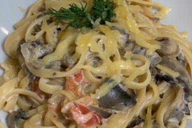 Паста с соусом из обжаренных грибов с луком и сыром пармезан, сливками и виски.