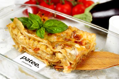Слоеная запеканка из пасты с мясным соусом, тертой моцареллой и ломтиками колбасы пепперони.