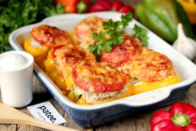 Сладкий перец с начинкой из фарша индейки с коричневым рисом, луком, чесноком и томатным соусом.