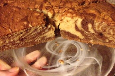 Пирог из двухцветного теста (белого и шоколадного), выложенный в форму слоями. При желании можно залить пирог шоколадной глазурью и посыпать орехами.