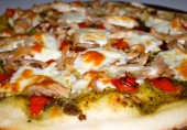 Вкуснейшая пицца с куриным филе, запеченным красным перцем, соусом песто и моцареллой.