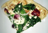 Греческая пицца с куриным филе, вялеными помидорами, оливками каламата, луком, шпинатом и сыром фета.