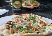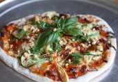 Пицца с куриным филе, шалотом, кабачком и соусом чили, посыпанная рубленым пеканом и свежей зеленью.
