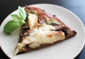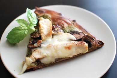 Пицца с курицей, грибами, моцареллой и песто из орехов макадамии, чеснока, базилика и тертого пармезана.