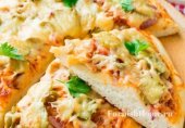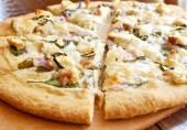 Вкуснейшая пицца с куриным филе, беконом, спаржей, артишоками и сырным соусом.