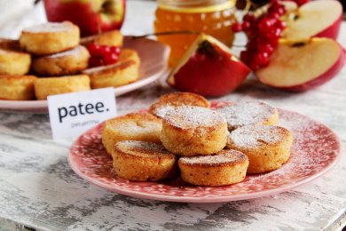 В творожное тесто для сырников по этому рецепту добавляем мелкие кубики сочного яблока, а муку заменяем манной крупой.