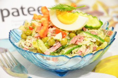 Готовим вкусный, сытный и яркий салат из капусты с колбасой, сладким перцем и горошком.  Салат из молодого картофеля, отваренного и нарезанного ломтиками, со сметанно-горчичной заправкой, зелёным луком и яйцами!  Этот яркий морковный салат с горошком и яйцом обязательно стоит включить в своё меню каждому - он богат витаминами В, РР, С, Е, К в ней присутствует каротин, за счёт большого количества вареной моркови и зелёного горошка, которые также обеспечивают салату аппетитную оранжево-зелёную цветовую гамму!  Сытный и питательный салат с вареными куриными желудочками, яйцами, обжаренными луком и морковью отлично подходит для повседневной трапезы.  Хрустящий, сочный, свежий, лёгкий и очень-очень полезный салат из черешкового сельдерея (тоесть из стеблей сельдерея), свежих огурцов, вареных куриных яиц и перьев зелёного лука.