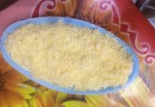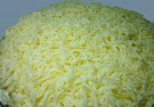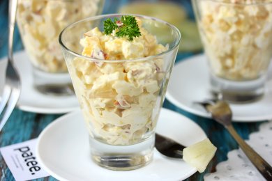Куриный салат с консервированными ананасами, сыром и чесноком, заправленный майонезом. При желании можно добавить немного рубленых грецких орехов.