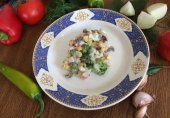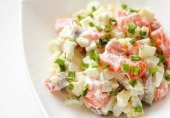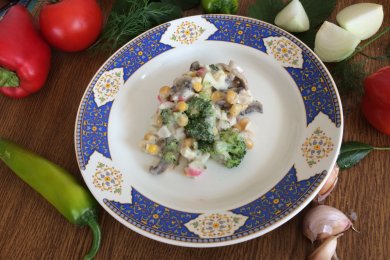 Вкусный праздничный салат, который можно приготовить и в качестве повседневного блюда. Этот салат сочетает в себе свежие и соленые продукты одновременно, поэтому его не нужно дополнительно солить.