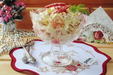 Очень нежный и вкусный салат, который быстро и легко приготовить для любого торжества или семейного стола.