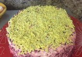 Чтобы салат Селедка под шубой выглядел празднично, предлагаю вам идею оформления в виде торта. Он готовится по классическому рецепту, все ингредиенты выкладываются слоями.