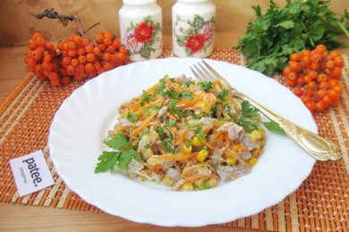 Рецепт приготовления салата с курицей, грибами, морковью и кукурузой очень простой и быстрый, но вкусовыми качествами он вас порадует, я уверенна.