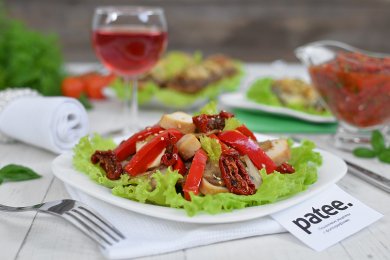 Изысканный салат с курицей, грибами, печеным перцем и вялеными помидорами украсит любое торжество. Помидоры я вялю сама, причем очень много.