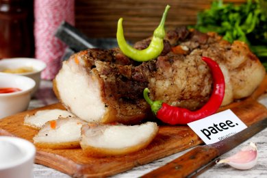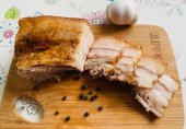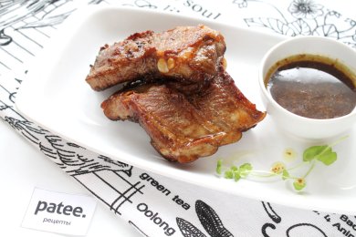 Свиная грудинка, натертая смесью шалфея с чесноком и специями, запеченная в духовке в глазури из винного уксуса с соевым соусом.