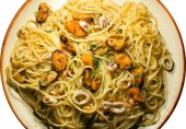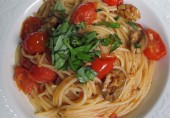 Отведав это изысканное, но вместе с тем простое в приготовлении блюдо, вы по достоинству оцените потрясающее сочетание чёрных спагетти с чернилами каракатицы (Spaghetti al nero di seppia), обжаренных в чесночном масле креветок и помидор черри с добавлением острого перца чили!