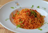 Рецепт прекрасной вариаций итальянской пасты — спагетти с томатным соусом. Блюдо получается довольно легким.