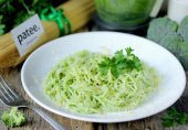 Готовим зелёные спагетти - пасту с соусом из капусты брокколи и свежей петрушки! Спагетти в таком варианте, несомненно, привлекают внимание едока прежде всего своим жизнерадостным приятным светло-зелёным цветом.