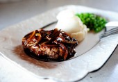 Стейк под перцем чили, и луком с бальзамическим уксусом