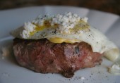 Стейк, обжаренный на гриле, с яичницей и раскрошенным козьим сыром.