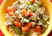 Говяжий стейк, маринованный в соевом соусе, обжаренный в масле и тушенный в соусе со сладким перцем и помидорами.