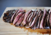 Стейк, маринованный в соевом соусе с хересом, медом, чесноком, имбирем и кунжутным маслом и приготовленное на сковороде-гриле.