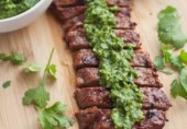 Говяжий стейк, маринованный в соевом соусе с чесноком, соком лайма и специями и приготовленный на гриле, с соусом чимичурри из перца халапеньо с луком, зеленью и соком лайма.