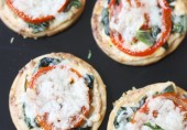 Легкая закуска из маленьких лепешек со шпинатом, острым чеддером, помидорами и базиликом.