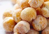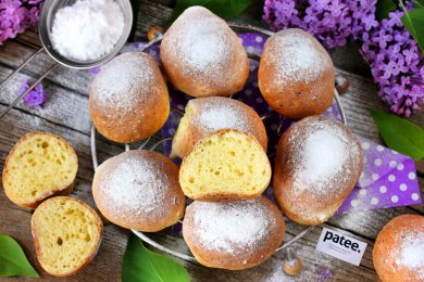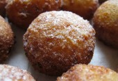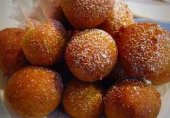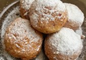 Пончики из творожного теста с лимонным соком, цедрой, изюмом и рублеными орехами, обжаренные в масле и посыпанные сахарной пудрой.