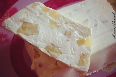Такой простой в приготовлении, но очень нежный и вкусный десерт на каждый день к чаю! Десерт называется “Старая Рига”, готовится на основе творога, сметаны, консервированных ананасов и желатина.