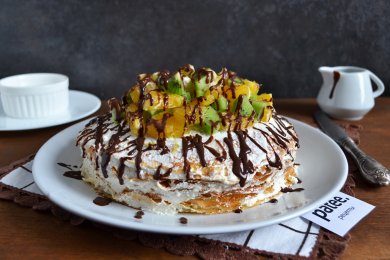 Хотите порадовать свою семью чем-то вкусным и оригинальным?! Приготовьте блинный торт. Тоненькие и румяные блины, нежный, воздушный крем и пикантные, ароматные фрукты - это невероятно вкусный и нежный блинный торт.
