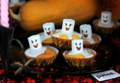 Тыквенные маффины с забавными приведениями из маршмэллоу- прекрасный десерт на Хэллоуин! Хотя их, без сомнения, можно приготовить и в будний день для разнообразия меню, и на детский день рождения (кто из детишек откажется отведать вкусное, полезное и оригинальное лакомство).