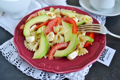 Очень вкусный, нежный и пикантный салат с пастой фарфалле, помидорами, авокадо и с моцареллой.  Паста с разнообразными соусами - известное и популярное блюдо. Сегодня у меня фарфалле с филе куриной грудки и шампиньонами.  Салаты с макаронными изделиями - это целый раздел в кулинарии. С ветчиной, бужениной, копченой и вареной колбасой, помидорами, огурцами, зеленым горошком, зеленым луком, маслинами, ананасами.  Салаты с макаронными изделиями давно вошли в наше меню, как праздничное, так и повседневное.  Необычный соус-фарш из свиного языка с овощами (луком, морковью и томатами) придаёт любой пасте непревзойдённый вкус, а красный перец и чеснок делают его в меру острым и пикантным!