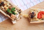 Ингредиенты:Багет — 2 шт.Куриное филе — 1 шт.Шампиньоны — 200 гПомидоры — 1 шт.Лук — 1 шт.Зелень любая — опциональноСметана — 250 гСыр — 100 гСоль — по вкусуПерец — по вкусу