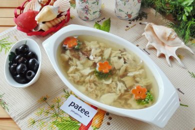 Небольшие кусочки индейки с шампиньонами в прозрачном, как слеза бульоне - лучшая закуска на праздничном столе.