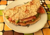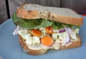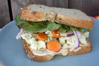 Вегетарианский бутерброд с соусом хумус, запеченным чесноком и свежими овощами.