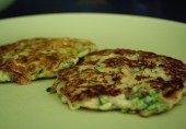 Оладьи из тертых кабачков с луком, хумусом и приправой, обжаренные на оливковом масле.