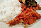 Куриное филе, смазанное хумусом и запеченное в духовке с морковью, брокколи и луком.