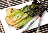 Блюдо из нежной зелени с острым соусом Срирача, приготовленное на гриле.