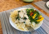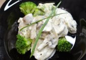 Куриное филе с брокколи и грибами в сливочном соусе.
