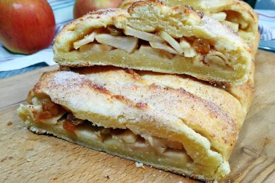 Легкое, воздушное, как пух, вкусное тесто и невозможно нежная начинка из сочных яблок, творога и сладкого изюма.