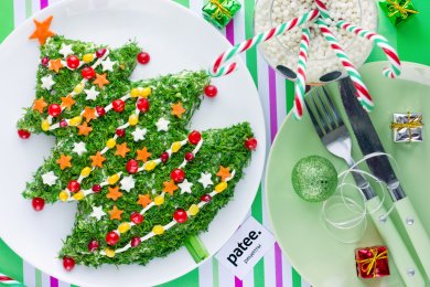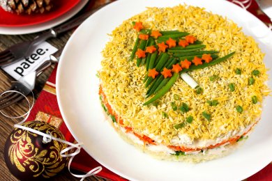 Готовим домашний салат в виде морской звезды, с сыром, крабовыми палочками, сельдью и яйцами покрытый “чешуйками” крабовых палочек.