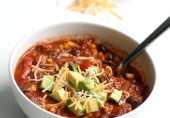 Суп с обжаренным говяжьим фаршем, консервированной фасолью, кукурузой, помидорами, сальсой и приправами ранч и тако.