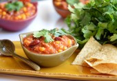 Вегетарианское чили с черной фасолью, помидорами, кабачком, кукурузой, сладким и острым перцем и специями.
