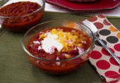 Суп чили с фасолью, говяжьим фаршем, кориандром, кайенским перцем, овощным соком, чеддером и дижонской горчицей.