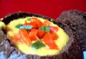 Вкусный, теплый морковный суп. А если хотите, чтобы он стал еще вкуснее, возьмите круглый хлеб, вырежьте в нем круглое отверстие и налейте в него суп.