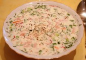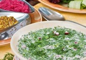 Один из многих вариантов окрошки, в основе которой лежит кисломолочный напиток тан. Такая окрошка получается чуть более кислой, чем, например, на квасе, но именно это дает ей дополнительный освежающий эффект в жаркий летний день.