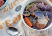 Ирландский суп с картофелем, белой и красной капустой, морковью и ветчиной.