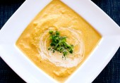 Сливочный, немного острый суп из тыквы сквош с перцем халапеньо, луком, чесноком, сливками, сыром и специями.