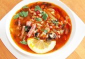 Сборная мясная солянка — классическое блюдо русской кухни. По сути, это наваристый мясной суп, который готовится из нескольких видов мяса с добавлением соленых огурцов, маслин, лимона и петрушки.