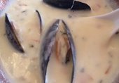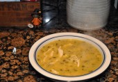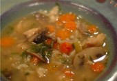 Суп, приготовленный из курицы, дикого риса, белого вина, приправленный чесночным порошком и тимьяном.
